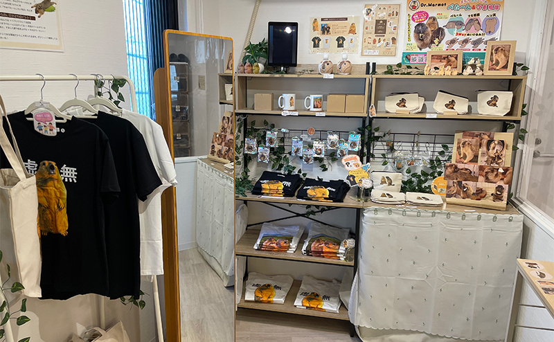 「マーモット村」では、キーホルダーやポーチ、マグカップなど、さまざまなかわいいグッズが販売されています。