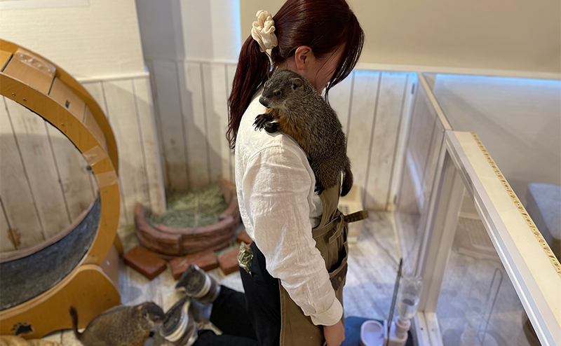 ウッドチャックがスタッフさんの肩に乗る場面も!