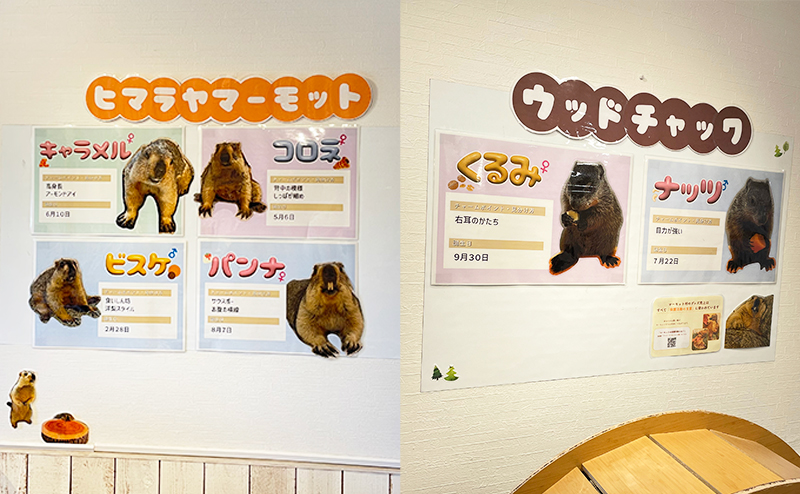 体験時は、ヒマラヤマーモットのキャラメルちゃん、コロネちゃん、ビスケくん、パンナちゃん、ウッドチャックのくるみちゃんとナッツくんの6匹を見ることができました。