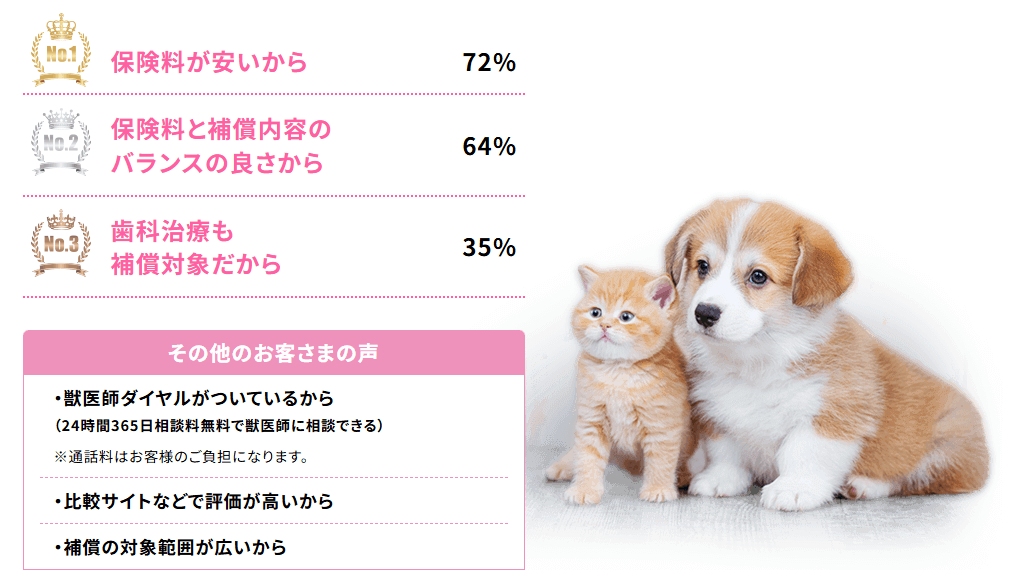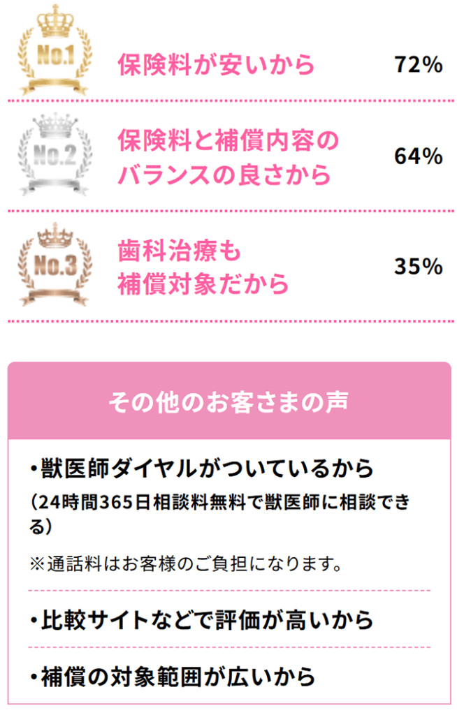 ケガや病気を理由に更新拒否をすることはないため、一生涯安心して続けられるペット保険です。